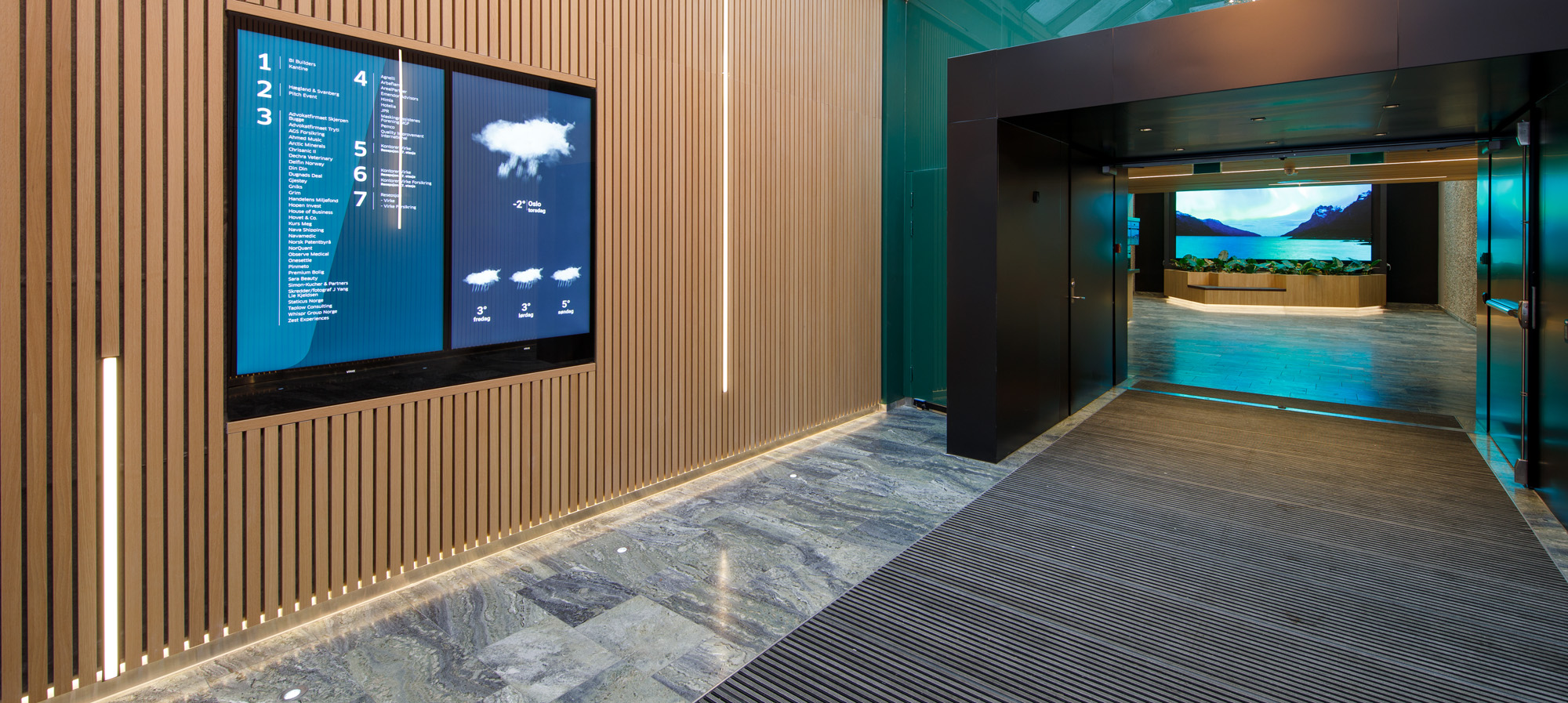I tillegg har løsningen en LED vegg på ca 4x4 meter i inngangspartiet. Innholdet er styres fra samme software.